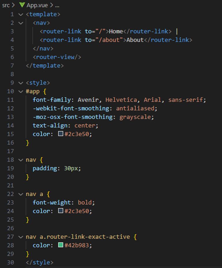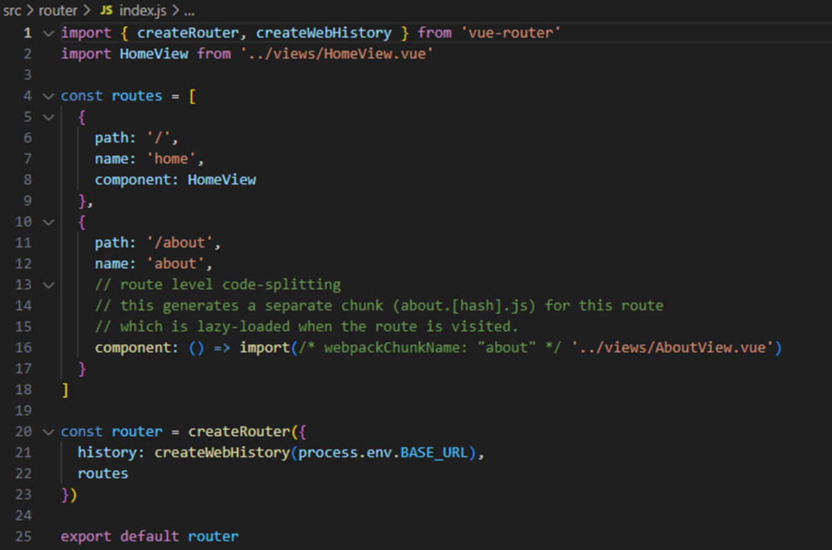 - routes를 통하여 About.vue, Homeview.vue가 실행된다.