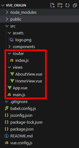 - 추가적으로 router를 바로 사용할 수 있도록 기본적인 소스와 views 폴더 안에 샘플 vue 파일이 만들어진다.