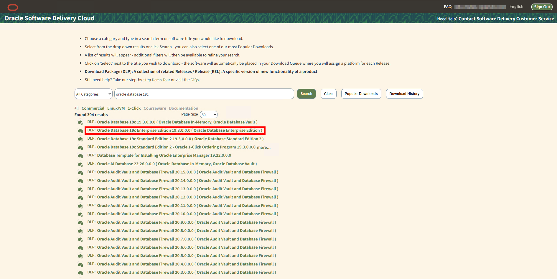 3. 로그인이 완료되면 Oracle 19C를 검색하고 아래 항목을 선택한다.