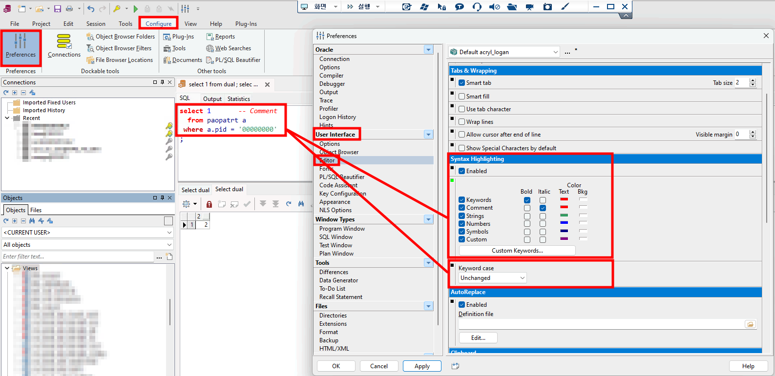 2. Configure - Preferences - User Interface - Editor로 들어가서 Syntax Highlighting 설정