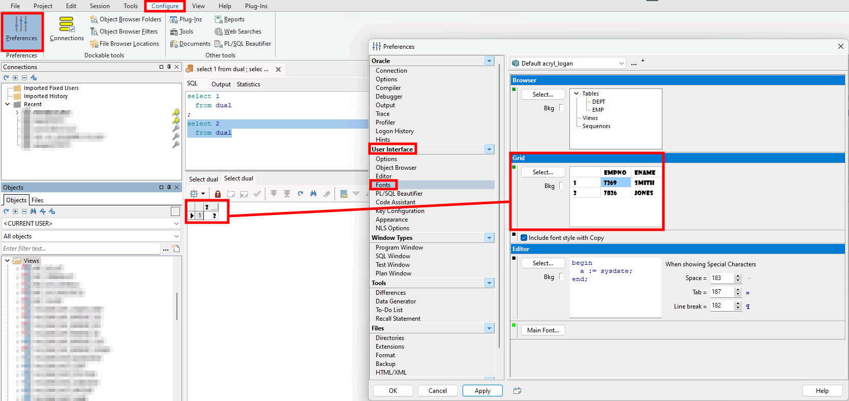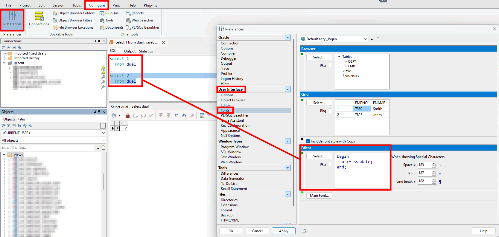 7. Configure - Preferences - Window Types - SQL Window로 들어가서 AutoSelect statement, Show gutter (line numbers) 체크