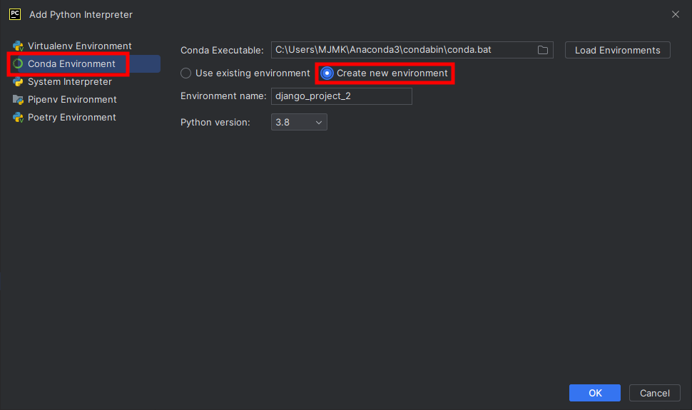 4. Anaconda를 사용하여 가상환경을 관리하기로 했으므로, Conda Environment - Create new environment를 선택, 나머지는 사용자에 맞게 설정하고 OK버튼을 누른다.
