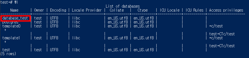 4. \l 명령어로 database가 생성되었는지 확인한다.