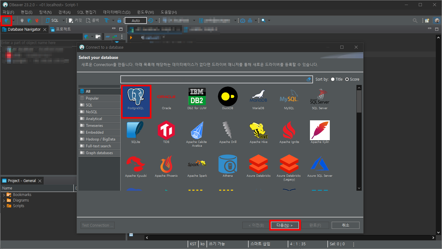 2. 아래 이미지와 같이 왼쪽 상단에 새 데이터베이스 연결 클릭 - PostgreSQL 클릭 - 다음을 누른다.