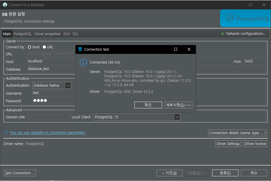 2. Database, Username, Password를 넣고 왼쪽 하단 Test Connection... 을 클릭하면 성공하였다는 메시지가 나온다.