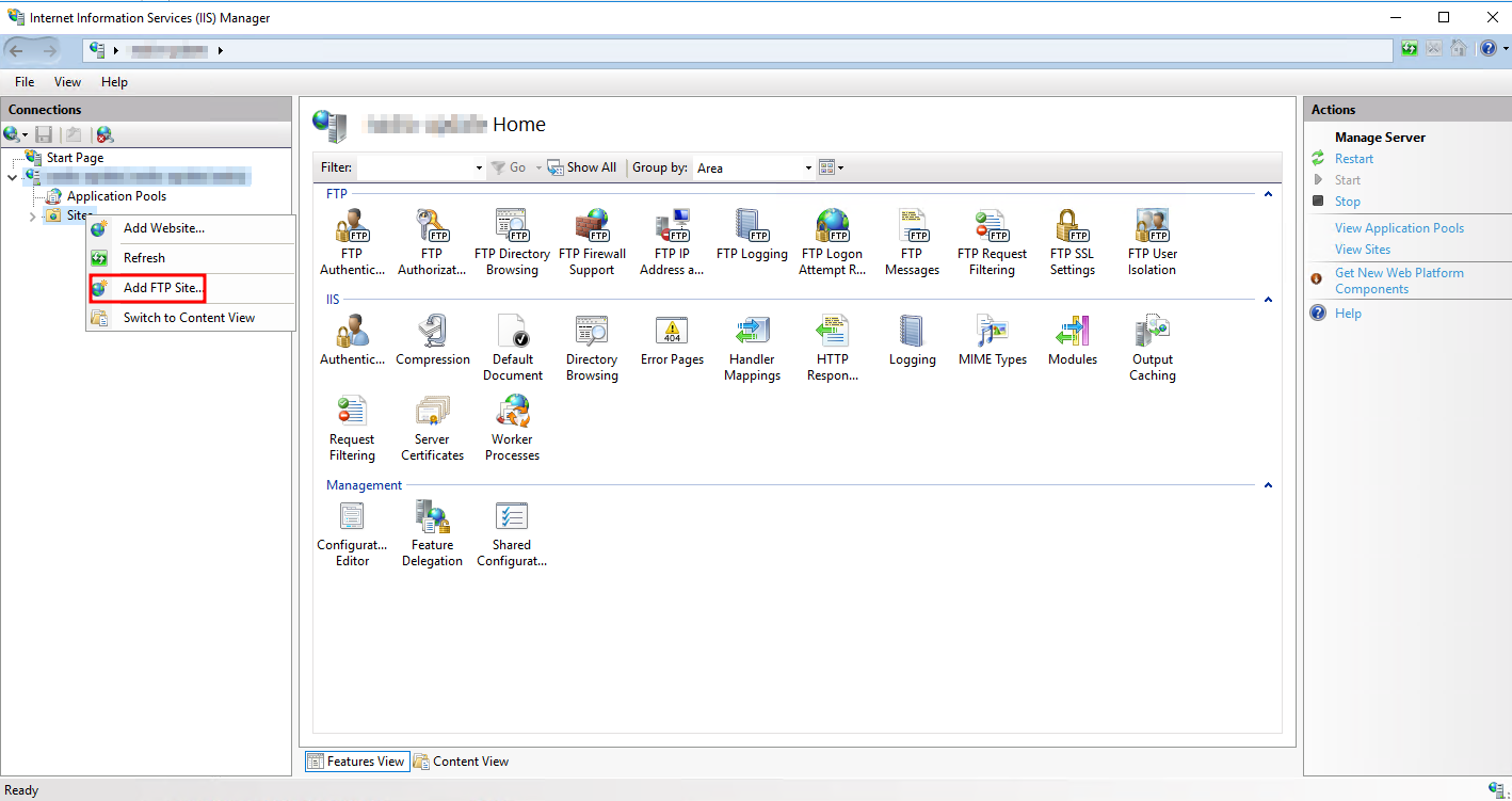 3. Sites에서 마우스 우클릭 후, Add FTP Site... 를 클릭한다. (Add FTP Site 메뉴가 안 보이면 상단의 [IIS설치 후, FTP 서버 설치 방법] 참고)