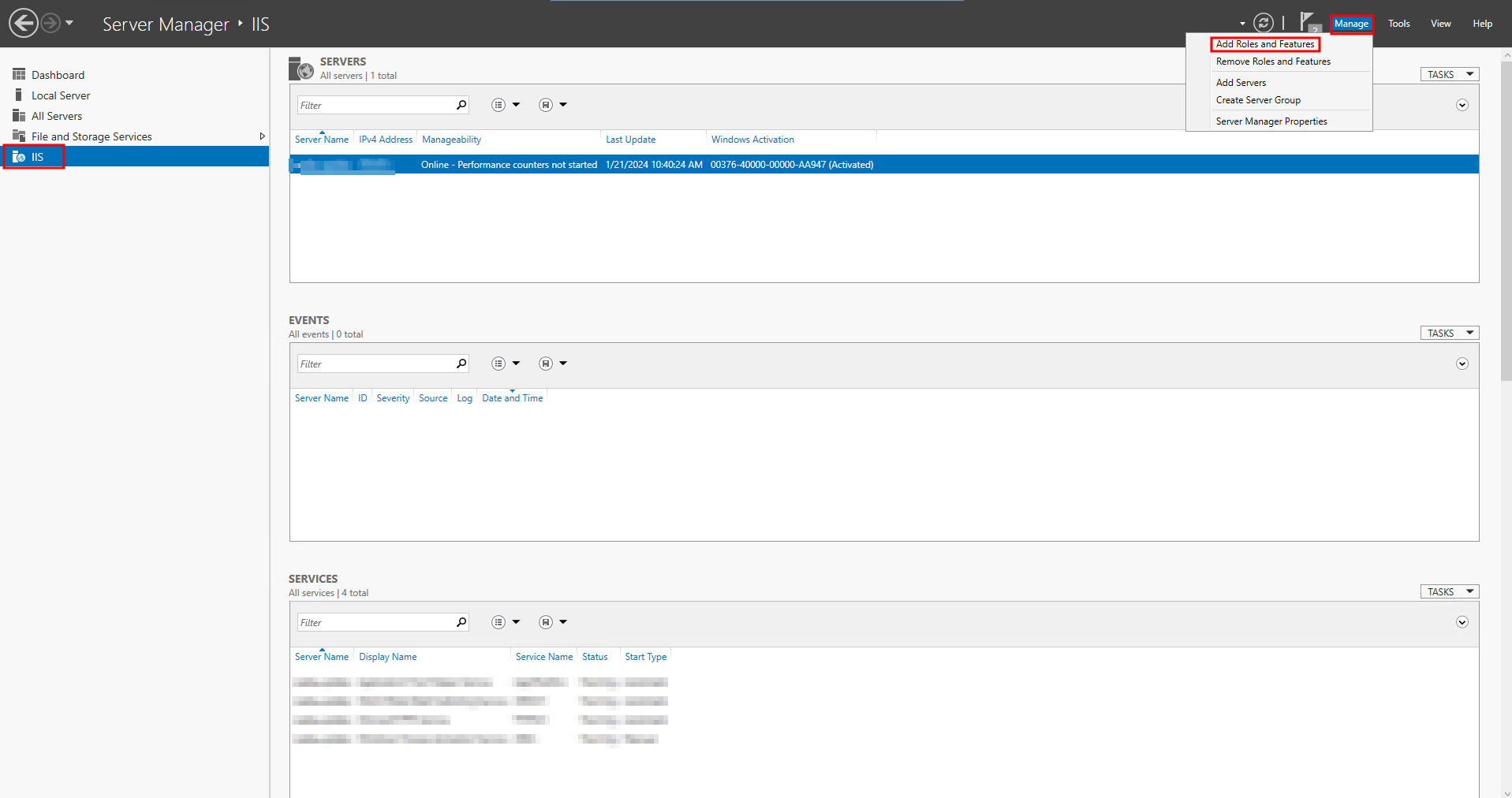 2. [IIS - Manage - Add Roles and Features]를 클릭한다.