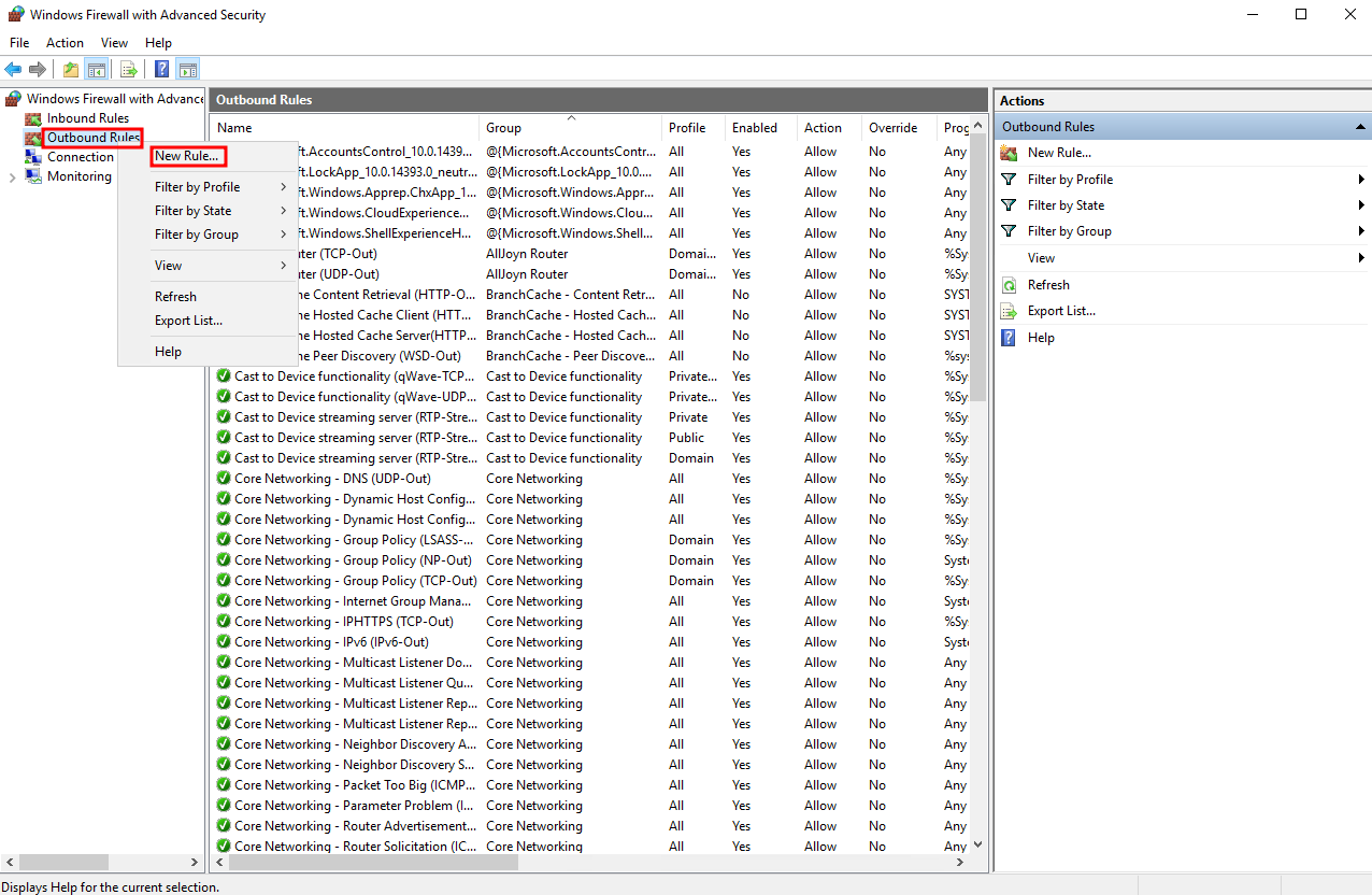 13. Outbound Rules에서 우클릭 후, New Rule를 클릭한다.