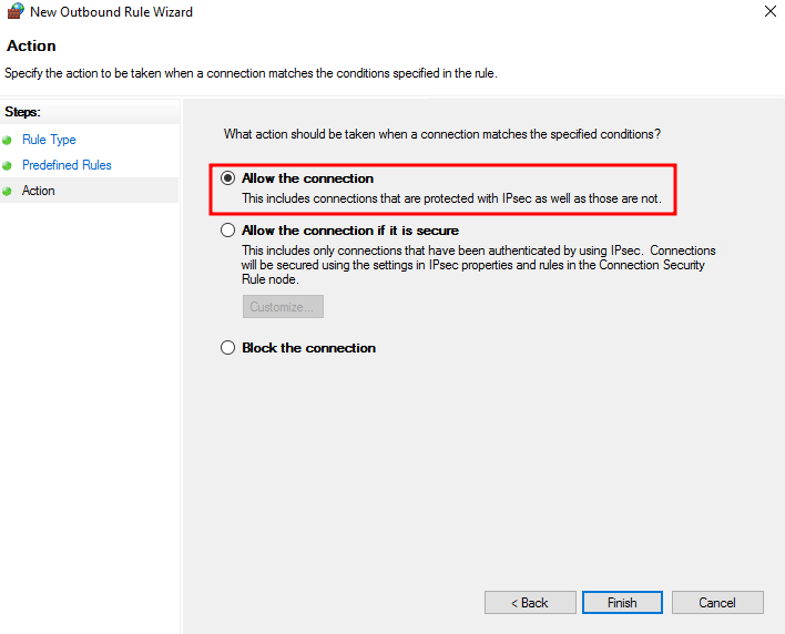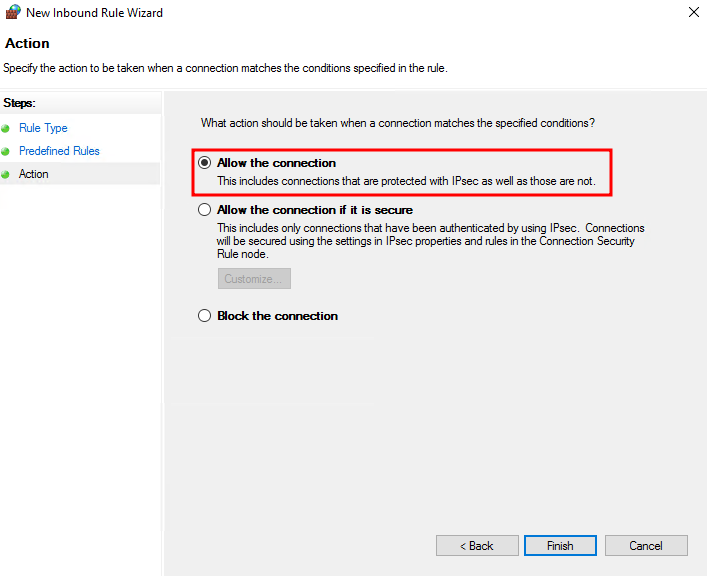 16. Allow the connection을 선택하고, Finish버튼을 누른다.