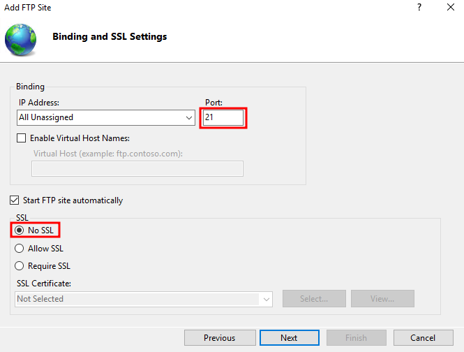 5. 각각의 정보를 입력한다. IP Address는 대부분 그대로 두고, Port는 원하는 Port로 지정한다. SSL은 No SSL로 변경한다.