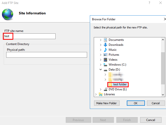 4. FTP site name을 입력하고, 업로드/다운로드할 경로를 지정한다.