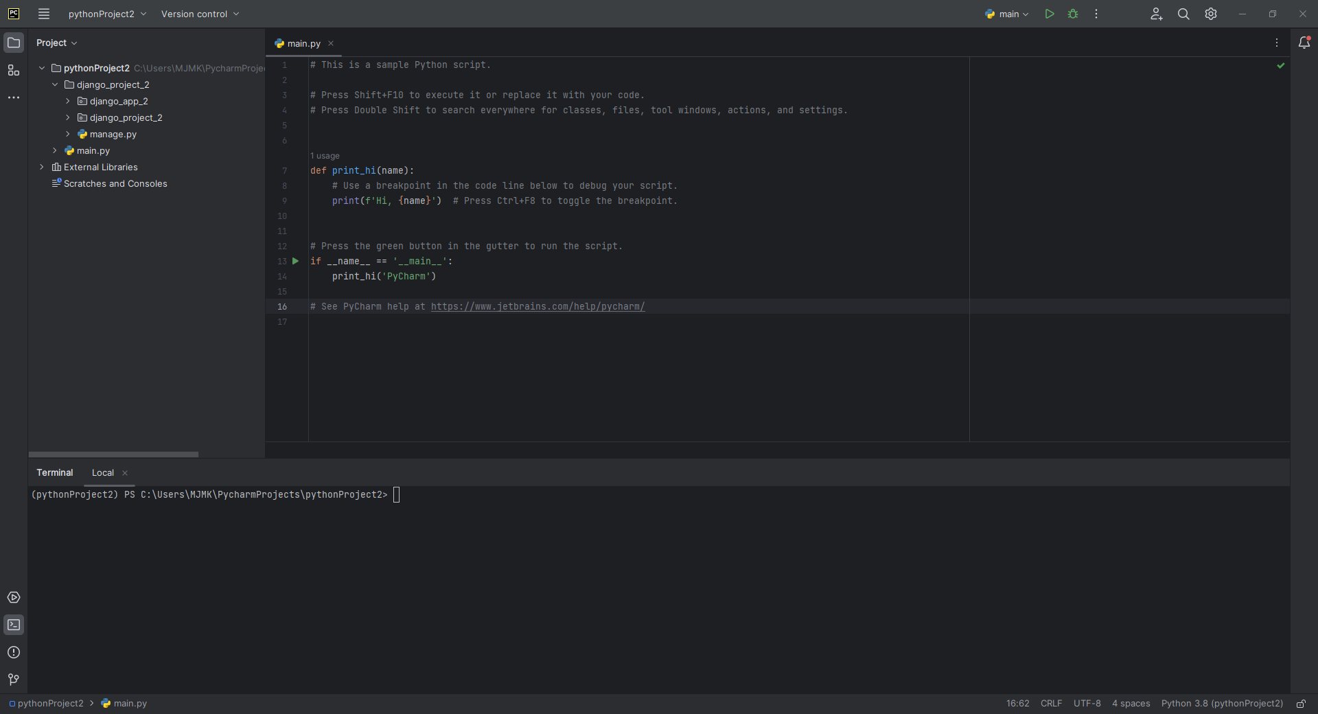 6. 5번까지 완료되었으면, 터미널 가상환경 상태가 django_project_2로 변경된 것을 볼 수 있다. 변경되지 않았다면, PyCharm을 재실행한다.