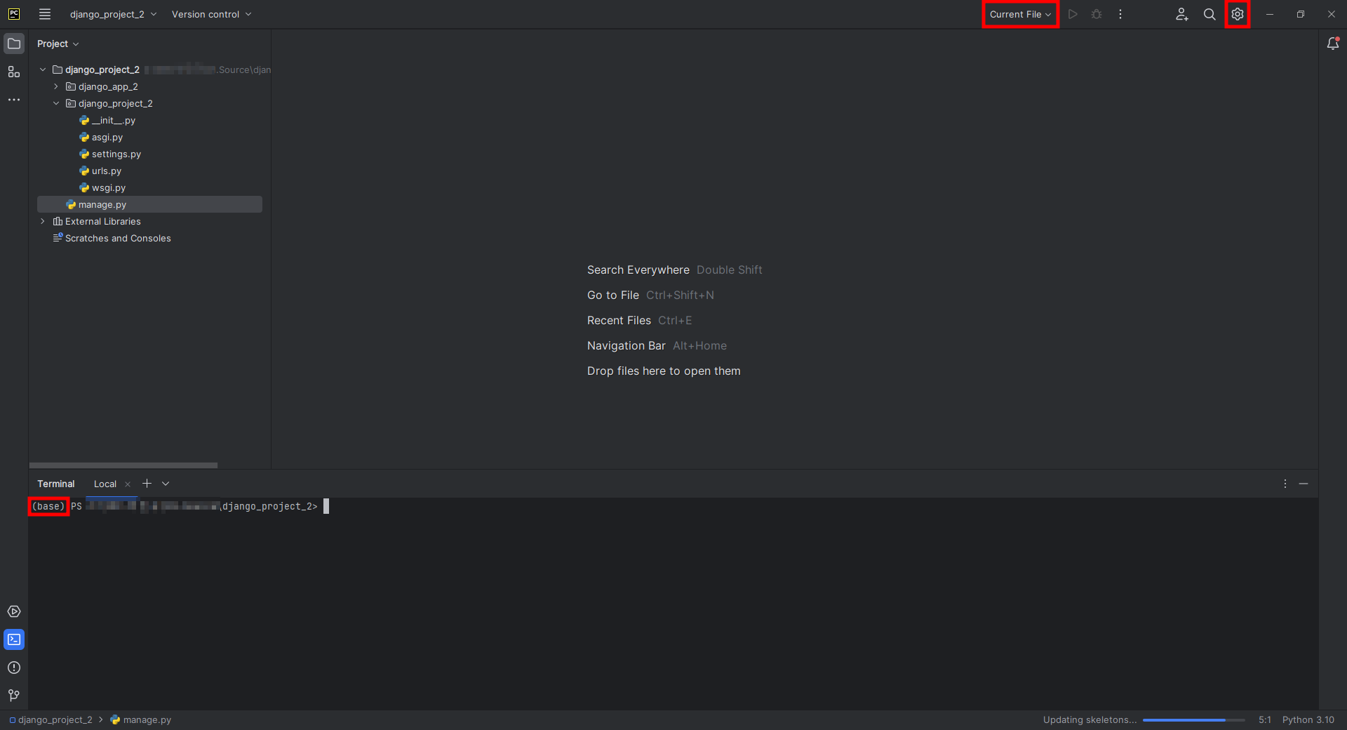 4. Project를 열어보면 pythonProject2 폴더가 사라진 것을 볼 수 있다. 추가적으로 가상환경은 [pythonProject2 → base], configuration은
