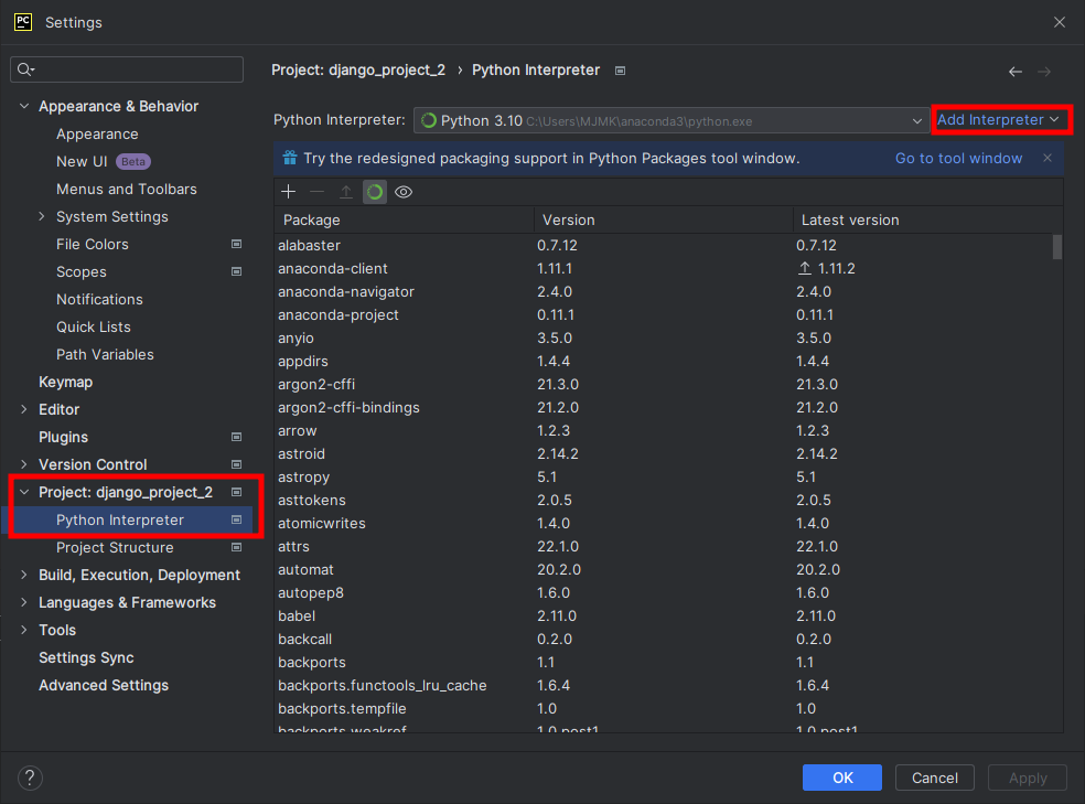 2. 왼쪽 Project: django_project_2(생성된 Project명) - Python Interpreter를 클릭한다.